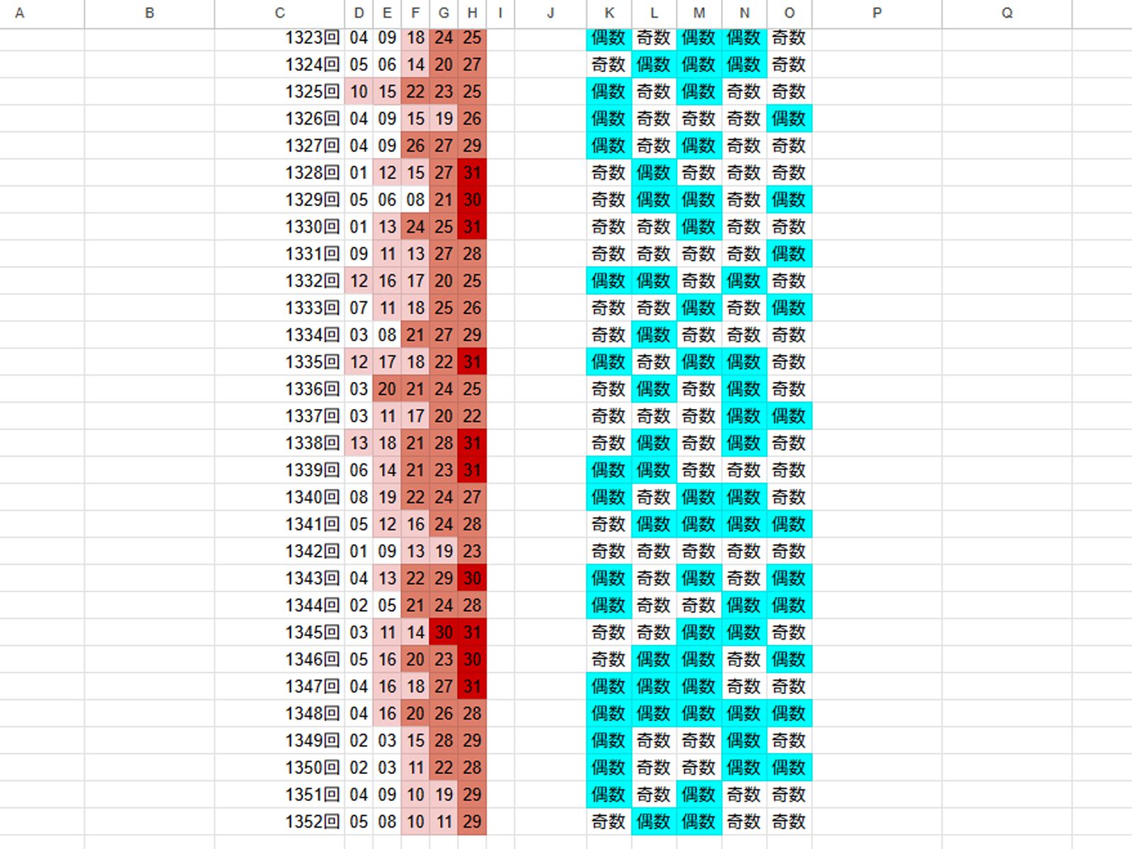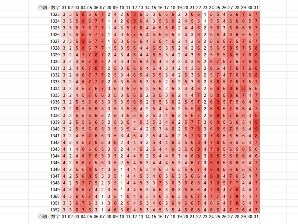 一番下が最新の抽せん結果で、色が濃い赤ほど、当せん数字に多く選ばれている数字です。