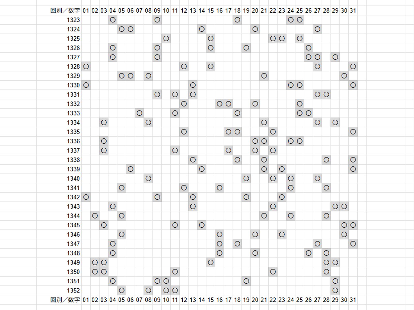 以下の画像は、直近30回分で出現した数字に〇を付けています。