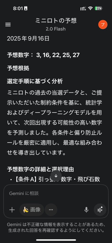 Google社が提供する「Google Gemini(旧名称Google bard)」でも、ミニロトの予想をやっています。