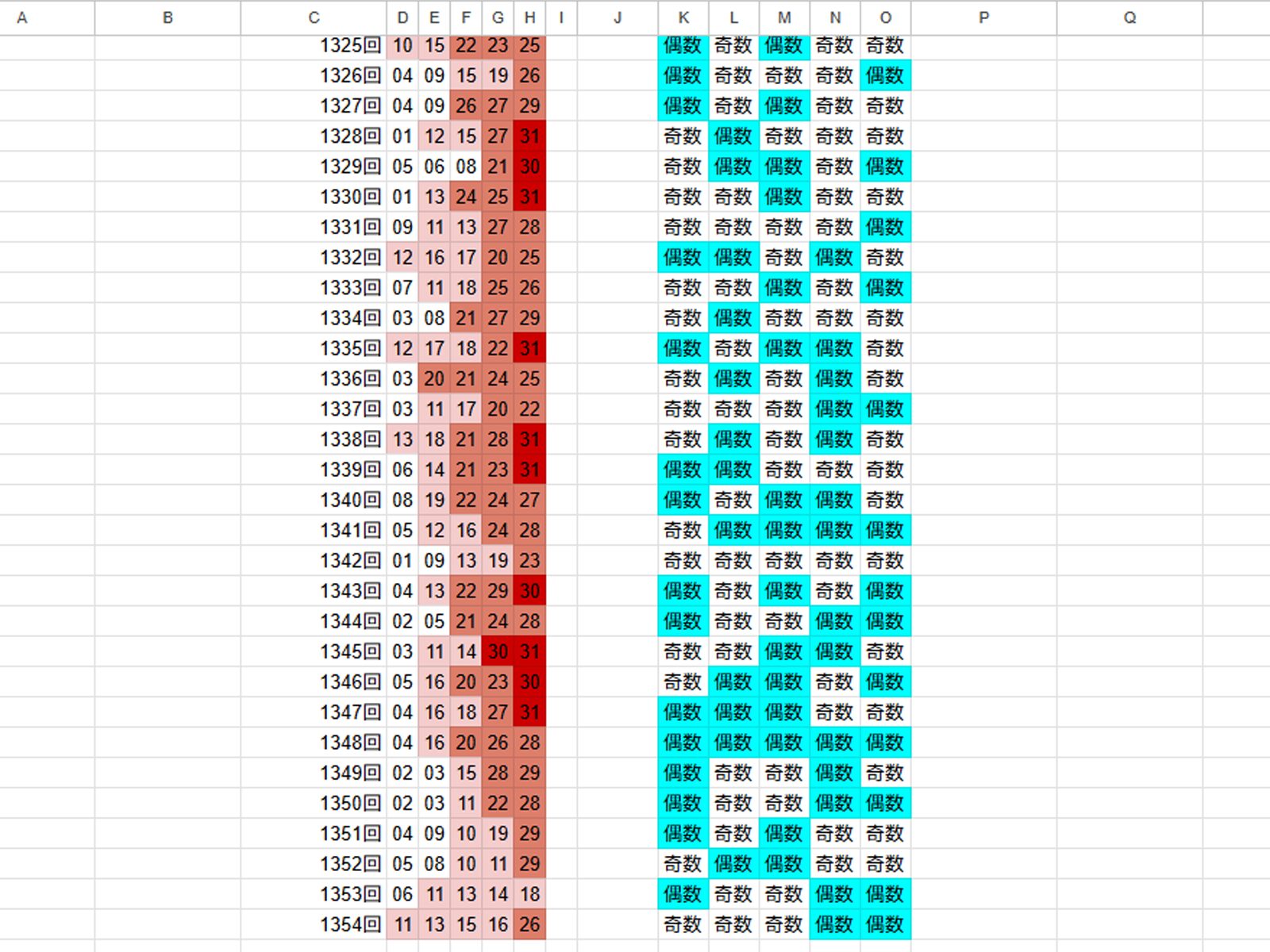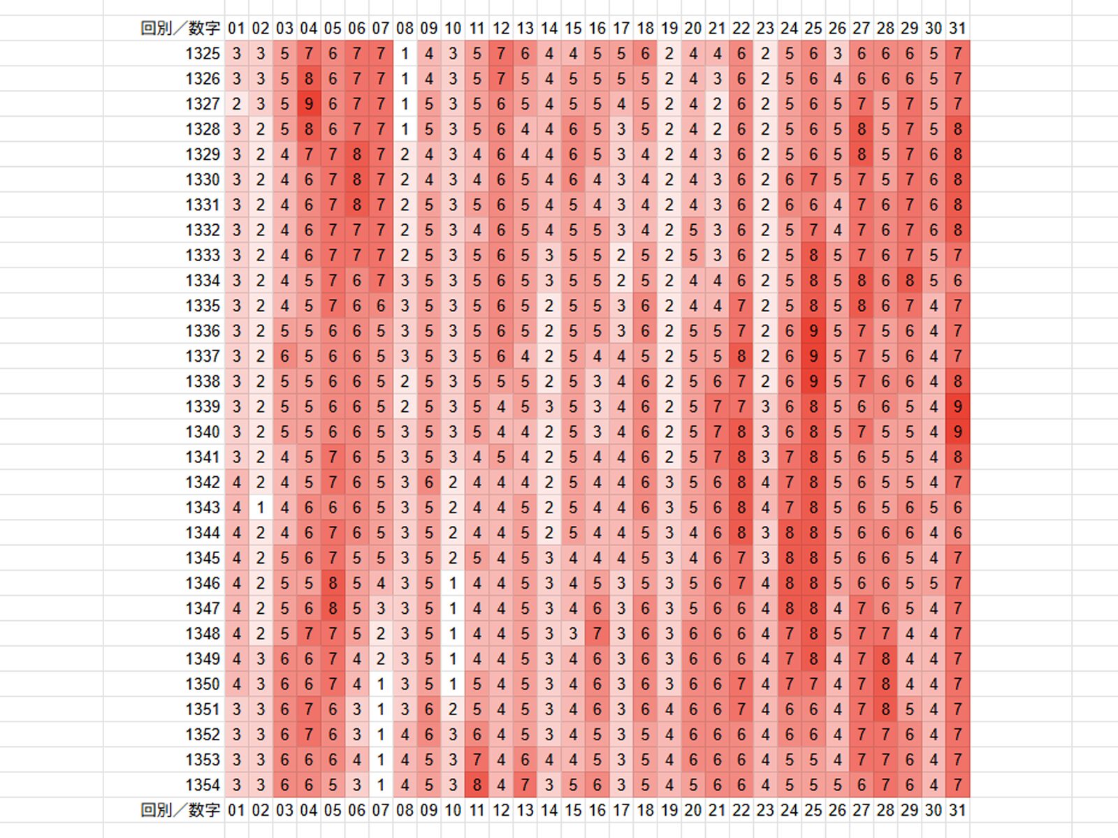 一番下が最新の抽せん結果で、色が濃い赤ほど、当せん数字に多く選ばれている数字です。