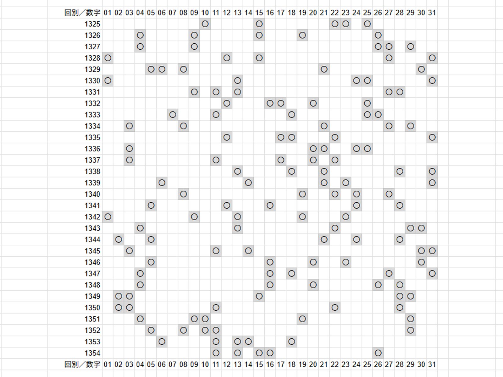 以下の画像は、直近30回分で出現した数字に〇を付けています。