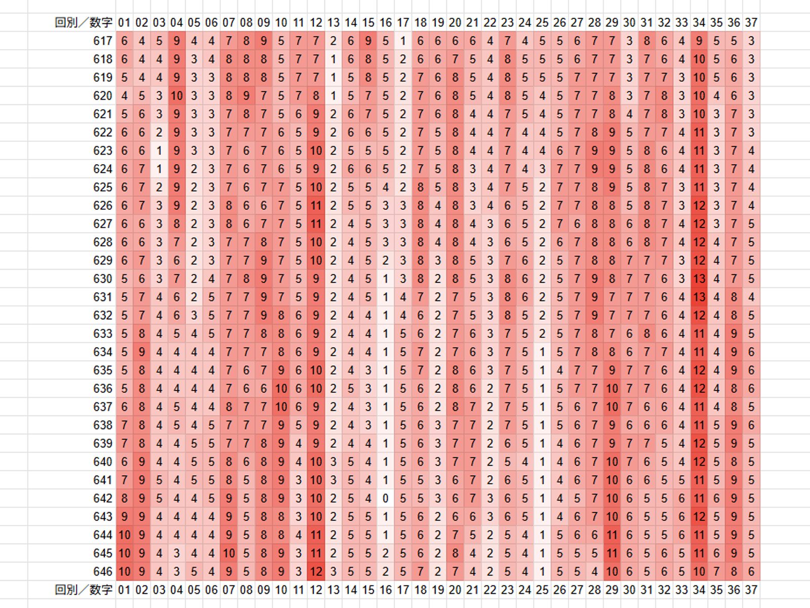 一番下が最新の抽せん結果で、色が濃い赤ほど、当せん数字に多く選ばれている数字です。