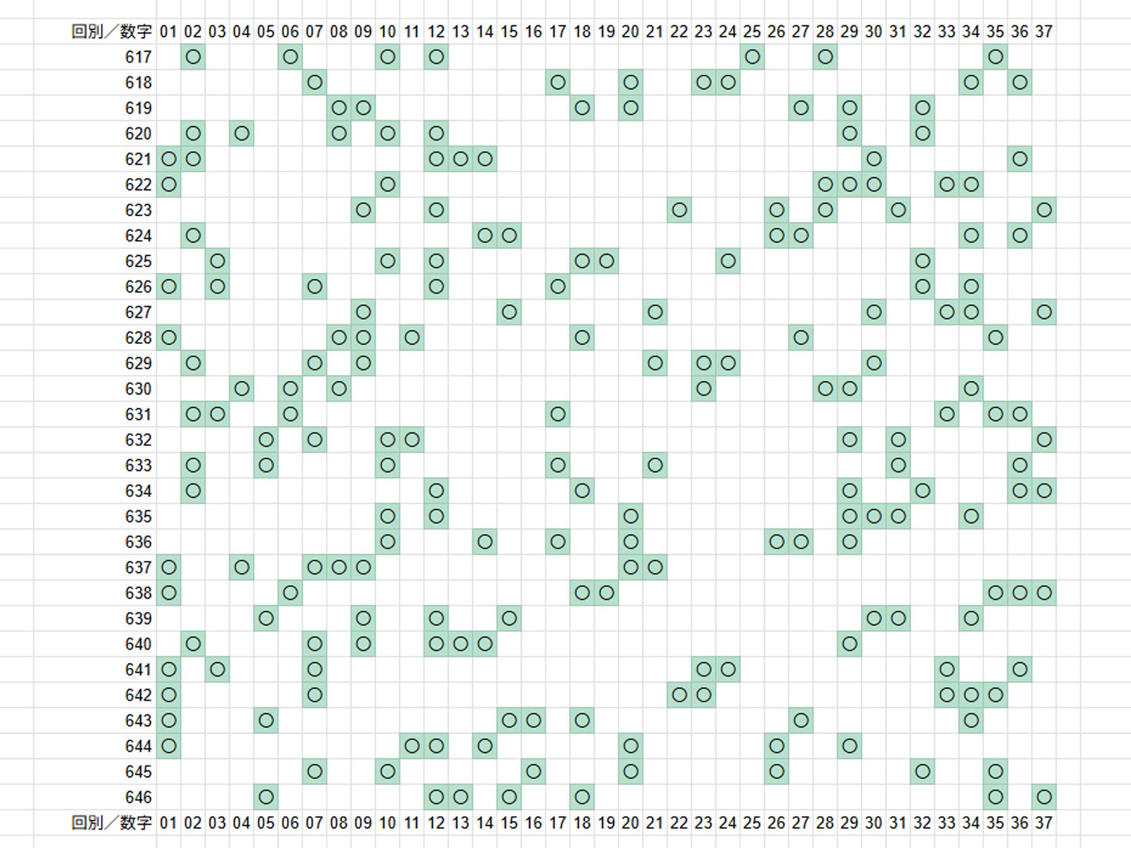 以下の画像は、ロト7の直近30回分の出目表で、出現した数字に「〇」を付けています。