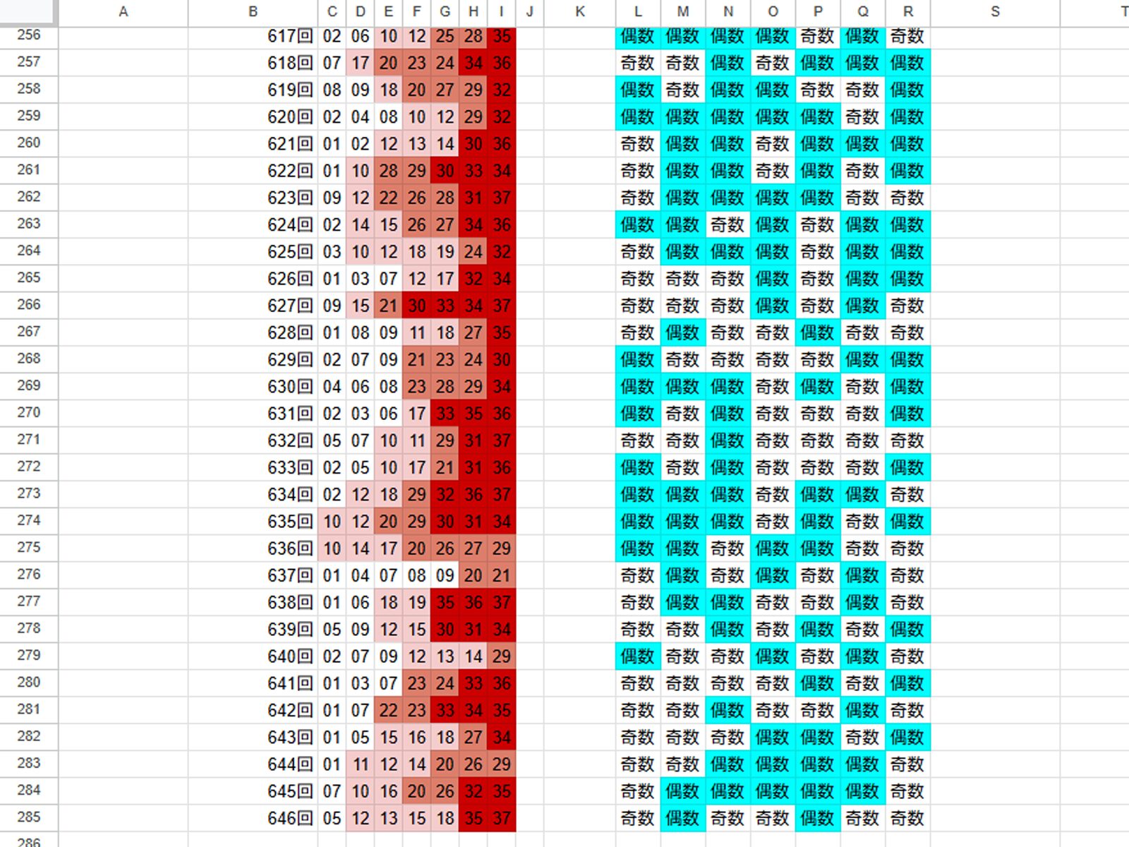 このように表で書き出してみると、一見バラバラに見えますが、実は偶数が続いたり奇数が続いたりしているので、この数字の流れをどう判断して予想していくのか?は、人それぞれの考え方次第です。