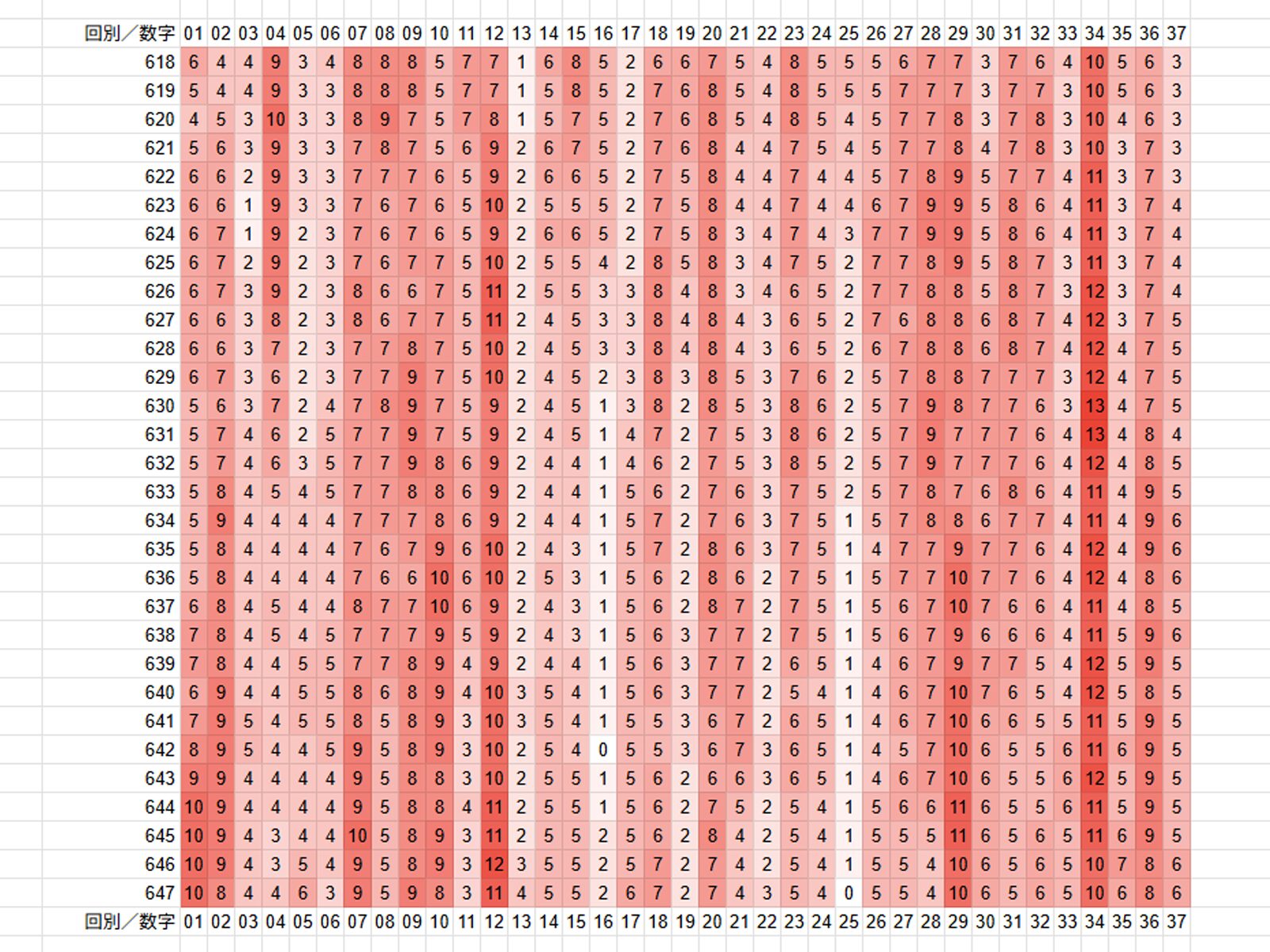 一番下が最新の抽せん結果で、色が濃い赤ほど、当せん数字に多く選ばれている数字です。