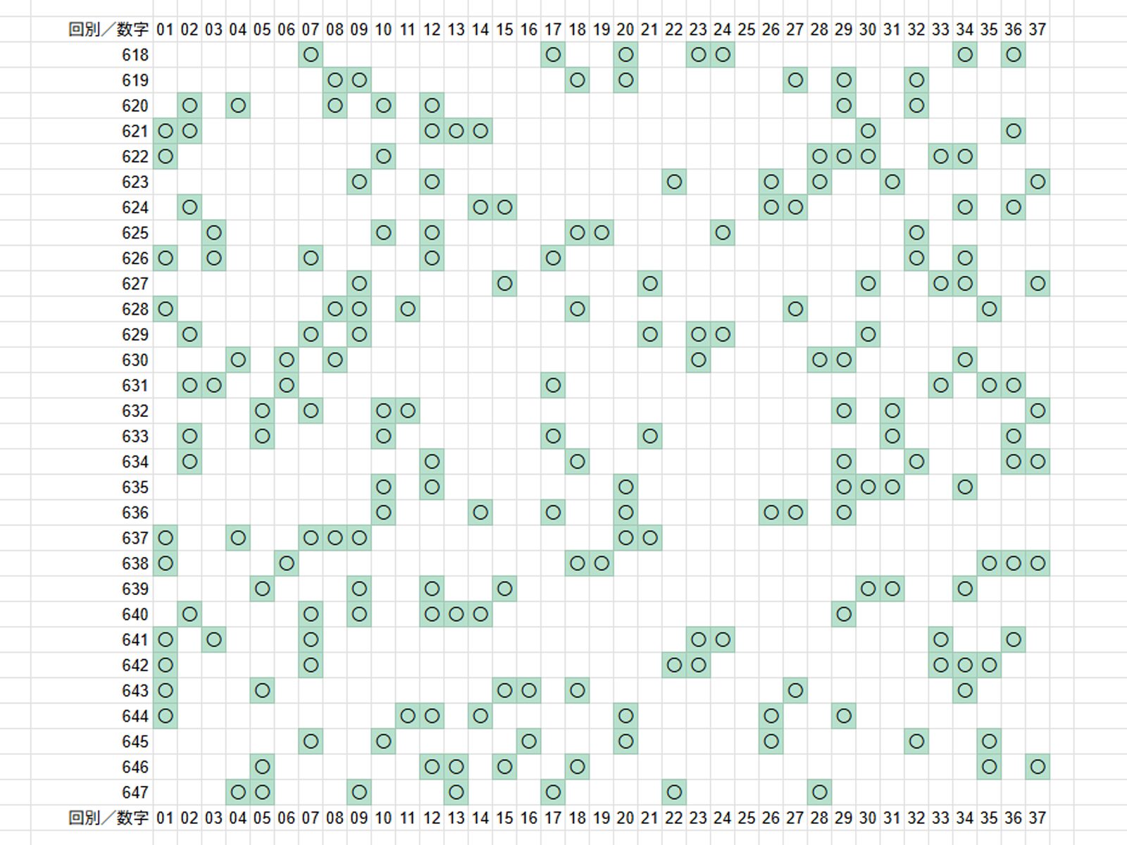 以下の画像は、ロト7の直近30回分の出目表で、出現した数字に「〇」を付けています。