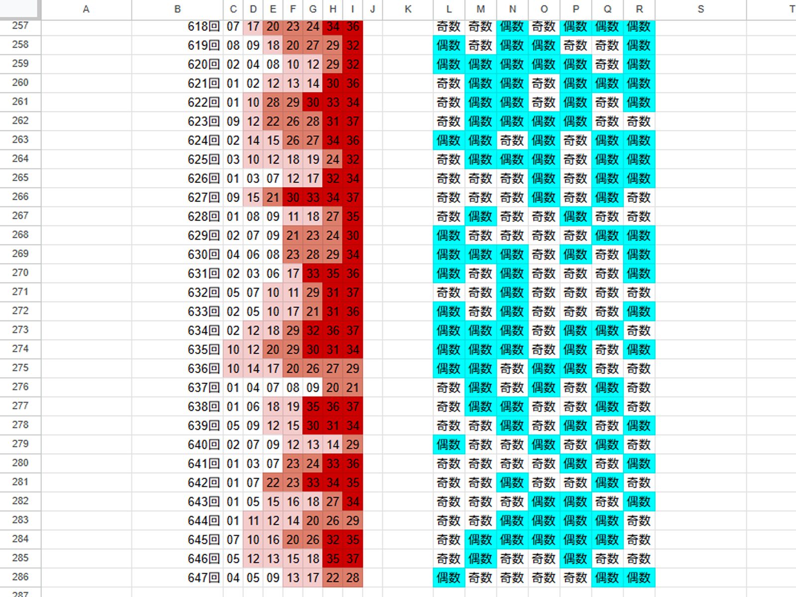 このように表で書き出してみると、一見バラバラに見えますが、実は偶数が続いたり奇数が続いたりしているので、この数字の流れをどう判断して予想していくのか?は、人それぞれの考え方次第です。