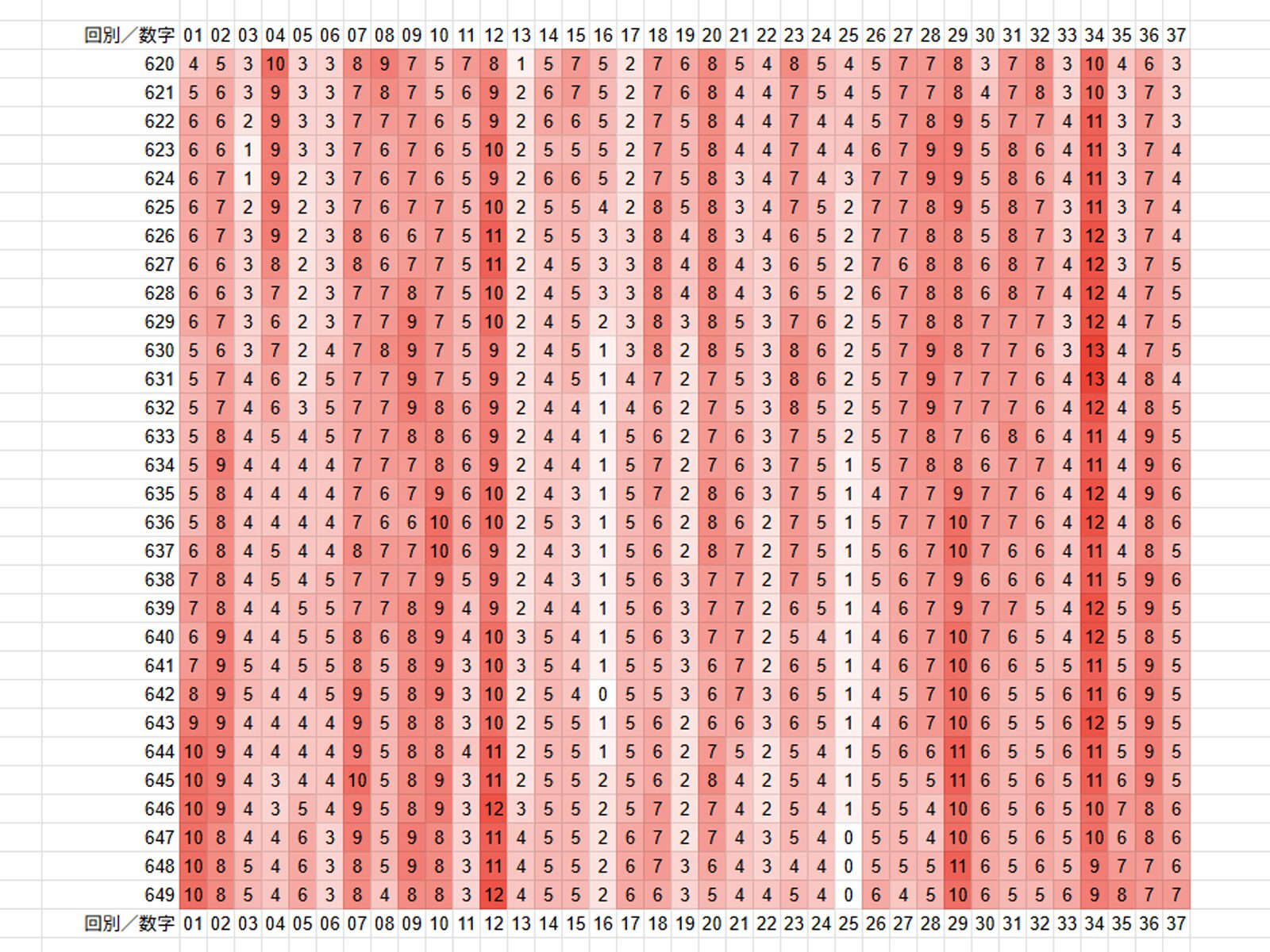 一番下が最新の抽せん結果で、色が濃い赤ほど、当せん数字に多く選ばれている数字です。