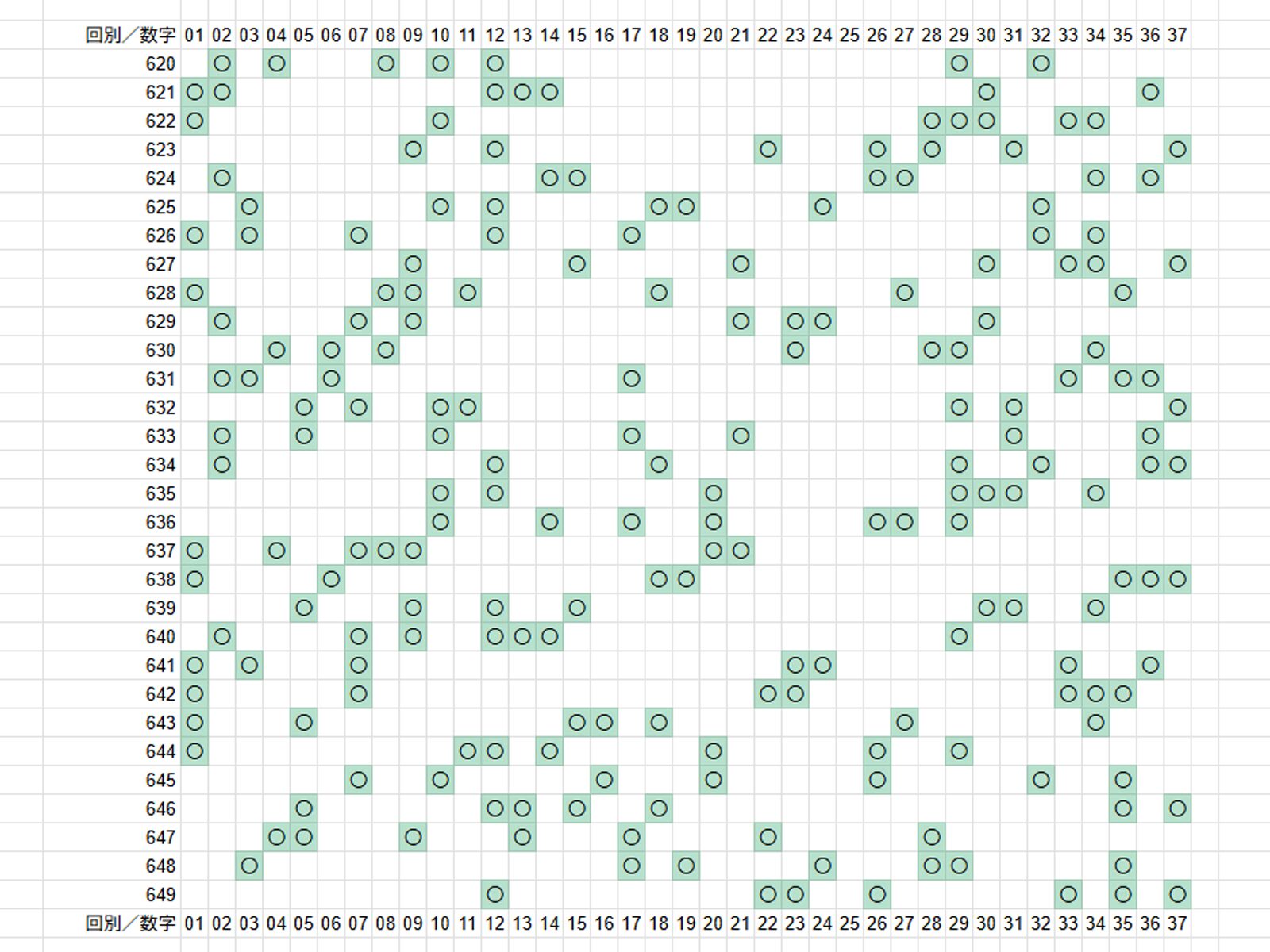 以下の画像は、ロト7の直近30回分の出目表で、出現した数字に「〇」を付けています。