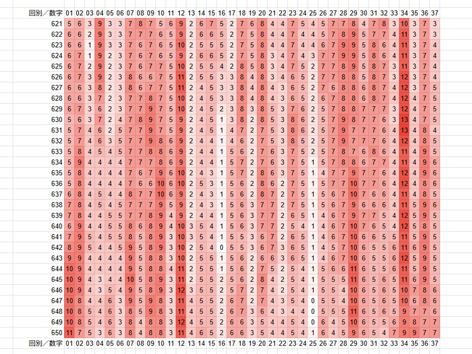 一番下が最新の抽せん結果で、色が濃い赤ほど、当せん数字に多く選ばれている数字です。