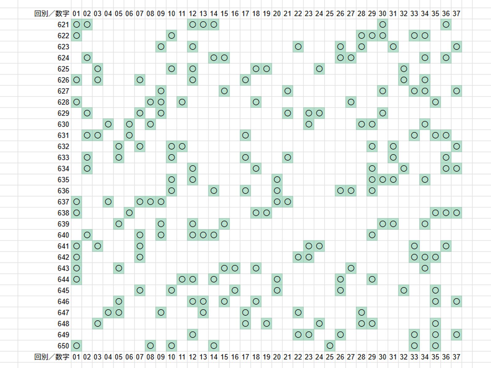 以下の画像は、ロト7の直近30回分の出目表で、出現した数字に「〇」を付けています。