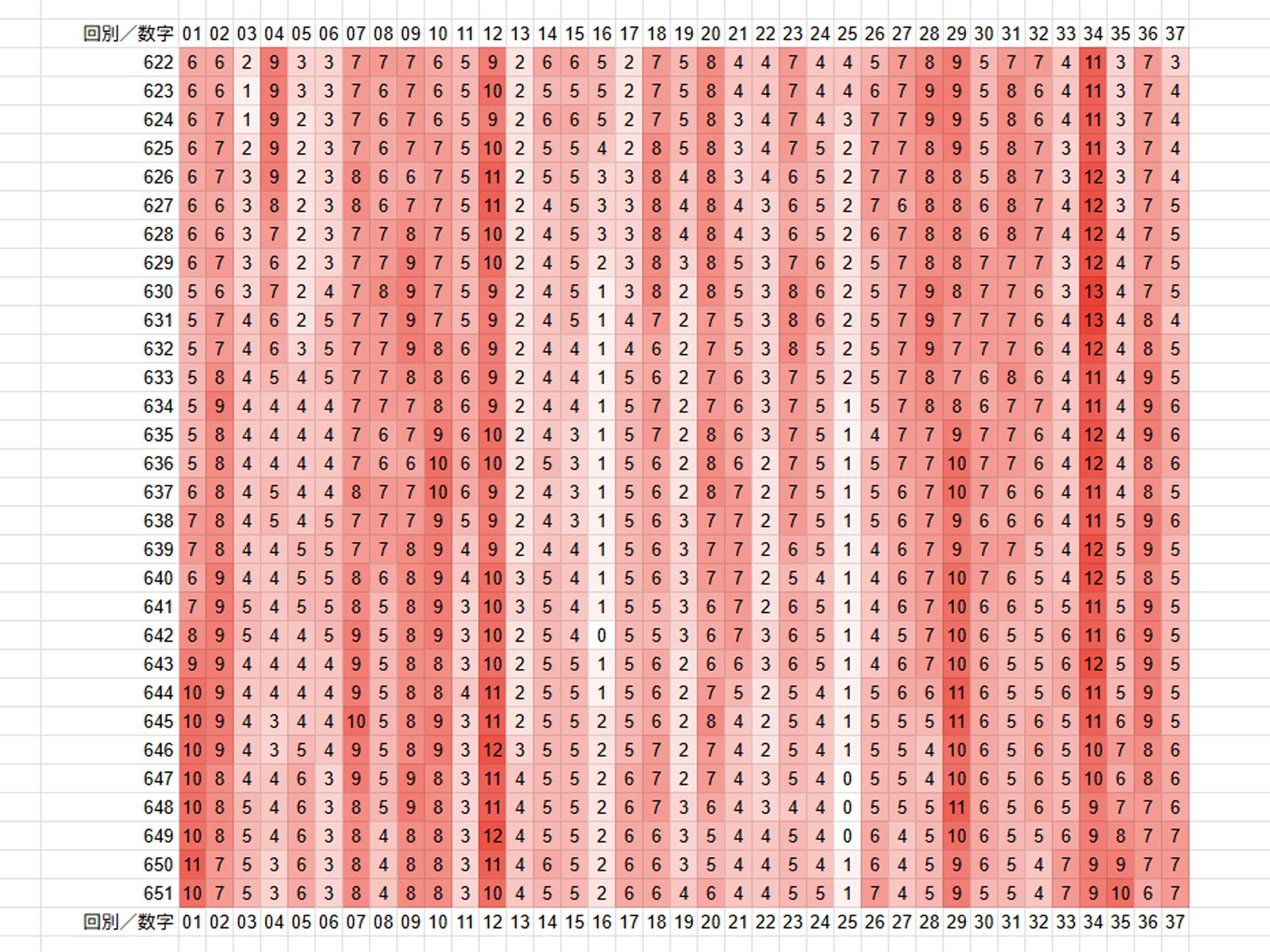 一番下が最新の抽せん結果で、色が濃い赤ほど、当せん数字に多く選ばれている数字です。