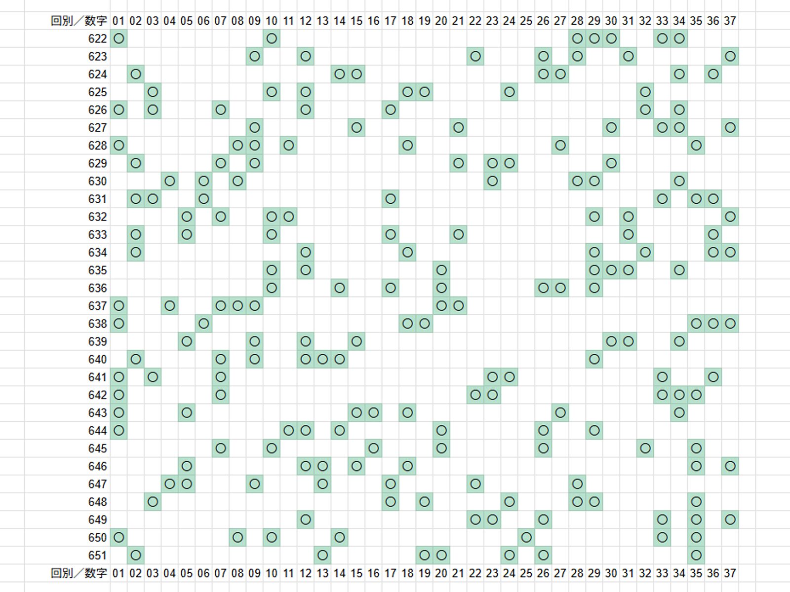 以下の画像は、ロト7の直近30回分の出目表で、出現した数字に「〇」を付けています。