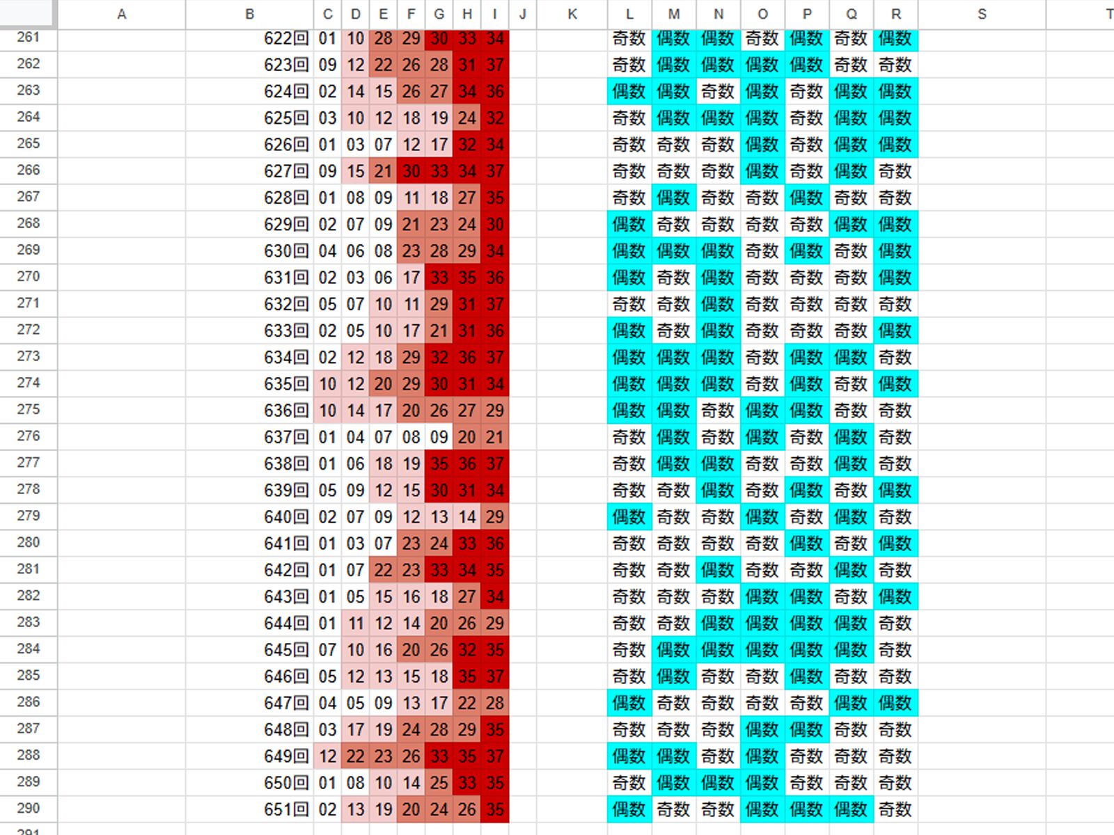 このように表で書き出してみると、一見バラバラに見えますが、実は偶数が続いたり奇数が続いたりしているので、この数字の流れをどう判断して予想していくのか?は、人それぞれの考え方次第です。