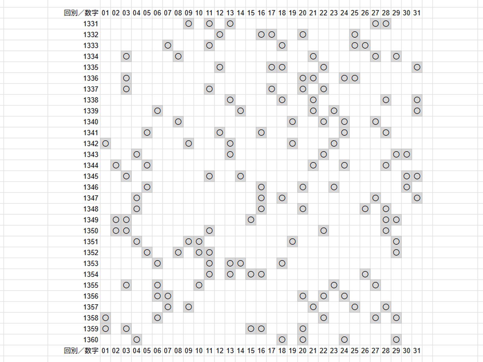 以下の画像は、直近30回分で出現した数字に〇を付けています。