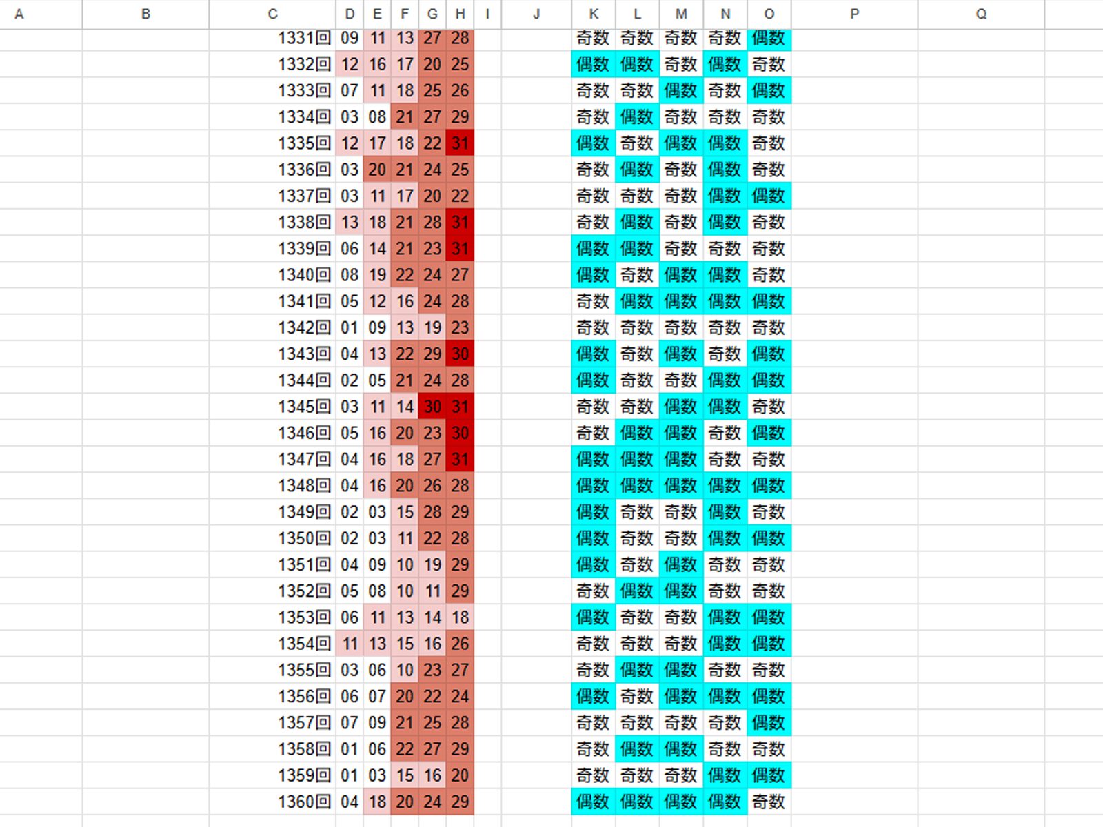 以下の表は直近30回分の、奇数と偶数の内訳です。