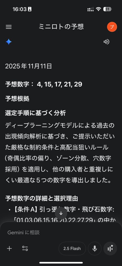 Google社が提供する「Google Gemini(旧名称Google bard)」でも、ミニロトの予想をやっています。